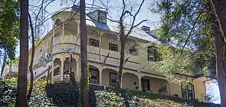 Engadine, also known as the Captain John K. Hoyt House and Engadine 1885 Inn, is a historic home located near Candler, Buncombe County, North Carolina. It was built in 1885, and is a 2+12-story, six-bay, rectangular plan, Queen Anne-style frame dwelling. It is richly decorated and features inset porches, cantilevered corner balcony, and varied shingled and sawnwork decoration. It is currently used as a bed and breakfast inn.[2]