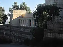 The site covers approximately 5⁄6 acre (0.34 ha),[16][17] measuring 248 feet (76 m) wide from west to east.[18] The house consists of a main building and a garage wing,[17][19] separated by an enclosed motor court.[20][19] A footbridge spans the motor court, connecting the main house's northern terrace with the garage wing.[13][20] In addition, there is a koi pond and swimming pool in the rear of the main house, as well as terraces and other open spaces overlooking Los Angeles.[19] The Ennis House overlooks Downtown Los Angeles[21][22] and Griffith Park to the east,[23] and it also faces the Pacific Ocean to the west.[24] The house is one of several buildings in Los Feliz designed by Wright and his apprentices; other such structures include the Lovell House and John Sowden House.[25] Prior to the development of Los Feliz, the site had been part of a Spanish-era land grant known as Rancho Los Feliz.[15]