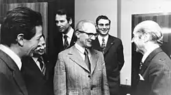 In 1977, at a meeting in Madrid between Berlinguer, Carrillo, and Georges Marchais of the French Communist Party, the fundamental lines of Eurocommunism were laid out. A few months later, Berlinguer was again in Moscow, where he gave another speech that was poorly received by his hosts and published by Pravda, the PCSU's official newspaper, in a censored version.[37] About democracy, Berlinguer said: "The experience gained has led us to the conclusion that democracy today is not only the ground on which the class adversary is forced to retreat, but it is also the historically universal value on which to found an original socialist society."[44] The years after Communists first joined the European Parliament in 1969 saw a process towards pro-Europeanism that culminated, for the 1976 Italian general election, in the candidacy within the PCI's electoral list of Altiero Spinelli, the Italian father of European federalism and one of the founding fathers of the European Union. In the words of historian Antonio Varsori, the PCI interpreted the pro-European option as "an opportunity to overcome the division of the old continent and for the birth of a socialist, neutralist, and tendentially pro-Third World Europe".[52]