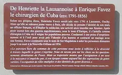 Enriqueta Favez may have been born into a bourgeois family in Lausanne, Switzerland,[2] around 1791. Her family origin is unverifiable, and undocumented. According to her own testimony, collected during a trial in Cuba, her parents died while she was an infant, and she was married to a French soldier at the age of 15 (c. 1806) by an uncle. Three years later, both her husband and infant daughter died. The former allegedly died in battle, the latter died for unknown reasons at eight days old.