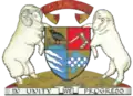 Above the shield in an Escrol Murrey in Letters Or is placed this Motto "SOUTHLAND", and on a compartment Vert below the Shield, along with an Escrol Argent bearing in letters Sable this Motto "IN UNITY WE PROGRESS".