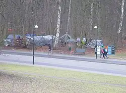 Since 1995, authorities in Berlin have operated a user-fee camping facility for seasonal Sinti workers on the Dreilinden property.[7] The facility houses up to 200 persons[10]: 39  and is a source of concern due to its location on the outskirts of Berlin, on a part of former Checkpoint Bravo.[7] Housing conditions are poor, while utilities and infrastructure is minimal.[7]