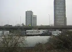 As of 2004, several hundred Sinti families resided on the outskirts of Heidelberg in a settlement in Henkel-Teroson-Street.[11][7] Most residents were unemployed; both the land and groundwater were believed to be contaminated.[11] Across the street from the site is a chemical plant operated by Henkel Chemical Company.[7] In spite of health concerns, as of 2004 no studies on health and environmental effects had been conducted.[11] The plot is owned by Heidelberg city and now holds "Notwohnungen" (emergency housing) and refugee accommodations constructed in 2006.[12][13] An environmental impact assessment for a planned neighbouring big-box store did not assess groundwater contamination in 2021.[14]