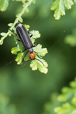 The adults of E. waterhousei, which emerge between April and July,[1] are recognisable by their dull black elytra with a greyish longitudinal stripe, extending from humeral angle towards apex of elytron, and orange-red head does not have black dorsal markings. Similar species include E. erythrocephala, the type and E. gorhami from Honshu, Japan.