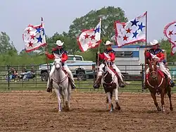 An equestrian drill team[1] is a group of horses and riders performing choreographed maneuvers to music. Teams typically perform at rodeos, horse fairs, parades, benefits, and drill team competitions. Drill teams are intended to entertain, show sportsmanship, horsemanship, teamwork and dedication. Competition drill at the national level is a controlled ride and has continuous forward motion. Some competition venues have set up special divisions of competition to provide for novice, rodeo, youth, gaited and special effects (as allowed at the venue) such as theme and drama. Theme drill provides a division that allows teams to showcase their uniforms, horse ability, music, and inclusions of trick riding or other variations.