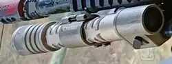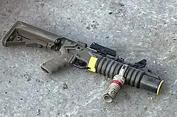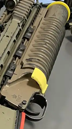 Grenade Launcher | 40×46 mm LV | New modified M203 grenade launcher fitting the M10 rifle and with the ability to fire high-velocity grenades.[36] It can be used standalone on a stock or mounted on the rifle.