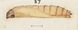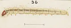 Its length, when full-grown, is slightly over 1⁄2 inch, very elongate tapering posteriorly and much flattened above; general colour ochreous with a brown dorsal stripe, indicating the position of the alimentary canal; the head is reddish-brown and very shining; the second segment dull brown and semi-transparent; there is whitish raised lateral ridge and similar intersegmental ridges; the legs and prolegs are very small, ochreous-brown and the whole larva is sparingly clothed with long bristles.[7]