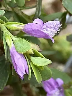 The flowers are usually borne singly in leaf axils and lack a stalk. There are 5 green, narrow triangular sepals 2–5 mm (0.08–0.2 in) long. The 5 petals are 7–12 mm (0.3–0.5 in) long and joined at their lower end to form a tube. The tube and the petal lobes on its end are lilac-coloured, lack spots and are glabrous on the outside. The lower, middle petal lobe and the inside of the petal tube is covered with long, soft hairs.[2]