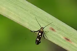 The forewings are blackish brown with more or less distinct whitish or white yellowish markings.[2]