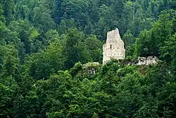 During the 11th century, the Lords of Erguel, or Arguel, moved from Franche-Comté and settled in the village of Sonvilier.[2] Exactly when they built Erguel Castle on a hill south-east of the village is unknown, but in 1178 and 1184 Heinrich von Erguël was mentioned ruling over the region.[1] The knights of Erguel owned land in the surrounding valley and held the vogt office over the church at Saint-Imier. The family kept the castle, the surrounding land and the lordship until 1264 when Otto von Erguel, who at the time lived in Basel, ceded them to the Prince-Bishop of Basel. In return the bishop granted him lands in Alsace.