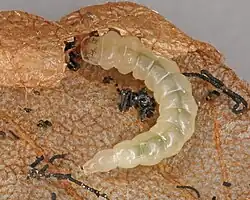 Eggs are laid on the leaf bud and the larvae feed on the leaves in a mine from the end of March to early-May. The mine starts at or near the edge of a leaf and widens into a blotch. The frass is string-like. The larvae have dark markings on the head and prothorax which lighten as it matures.[3][5] Pupation takes place in a tough silken cocoon in the soil.[3]