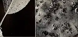 Where colonies of E. lanigerum feed on twigs and roots the tree forms galls, which are small initially but increase in size over time and are most damaging when they are formed among the roots. Continued feeding in the roots can destroy the roots and consequently reduce the growth of the tree or kill it. The aphids are attracted to the sunken sites caused by the perennial canker fungus Cryptosporiopsis perennans and the galls are then the most frequent places on the tree for the fungus to re-infect it.[6] The galls can also allow infection by Gloeosporium sp.[8] The galls are more sensitive to cold weather than the surrounding tissue and burst at -18 °C(0 °F), the resulting damage providing the fungus with an entry site for reinfection. As the aphids feed they produce a honeydew which drips onto the fruit allowing the growth of sooty mould which has an impact on the saleability of the fruit. The honeydew can also create unpleasant conditions for orchard workers to work in due to high levels of sticky honeydew excreted. The honeydew can also cover the leaves allowing the mould to grow there too.[7] The aphids can also infest the apples, especially on varieties with an open calyx when the aphis can feed on the apple core.[6]