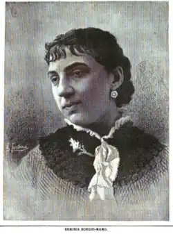 Erminia Borghi-Mamo made her opera stage debut in 1873, in Nice, in La forza del destino.[2] She was active in Italian opera for the next twenty years. "Still quite young, Mdlle. Borghi-Mamo is already mistress of the vocal art," an English writer reported in 1876, adding that "intelligence and soul are her characteristic qualities; she is all sympathy. The opening of her artistic career promises the most splendid future, for her voice is capable of the most delicate expression, and the most varied effects."[3] Her best-known roles included the title parts in Aida and Lucrezia Borgia, Santuzza in Cavalleria Rusticana, Margherita and Elena in Mefistofele,[4] and Leonora in Il trovatore. Her last performance was in 1893.[5]