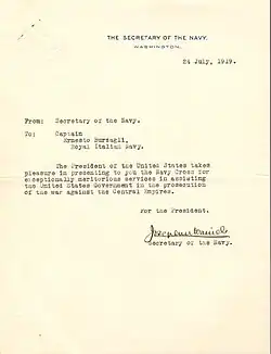 In February 1918, he was awarded the Military Order of Savoy.[1] In 1919 he was decorated with the Navy Cross by the United States Navy for his service to the Allied cause during the World War.