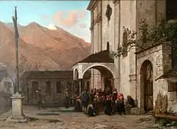 At Milan, in 1881, exhibited Un brutto incontro; at Turin, in 1884, Campagna ferrarese, at Venice, in 1887, another canvas titled: Arei campi.[1] He married in 1887 a woman twenty years younger, however, because of failed investments, he died poor.[2]