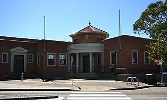 By the 1930s, with the announcement of the widening and realignment of Erskineville Road, the Victorian-era town hall was set to be demolished. As a consequence, Erskineville Council commissioned plans for a new town hall on a site adjacent to the old hall.[5] In 1936, an initial design by Sydney Architect Lindsay Gordon Scott was accepted. This design was an ambitious one, including two stories and a 75-foot-high clock tower.[6] This design however was found to be too expensive and grand for a small municipality in a primarily working-class area of Sydney and was revised to be the current design of a single storey building without the tower in a similar red brick Georgian revival style. In a tribute to the former council chambers, glass from the original town hall was incorporated into the new offices.[5][7]