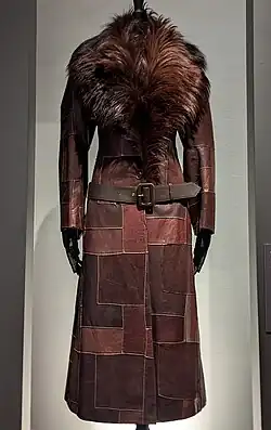 Faiers identified Look 58, the black hair coat, as another showpiece with hybrid messaging. When examined closely, there are grey hairs identifiable within the black, and in places, the hair is worn away to reveal the structure beneath. In showing the effects of aging, he felt that the "coat suggests the inexorable march towards old age and death". A person wearing it would, in his view, experience multiple levels of "becoming" – "becoming-hair, becoming-yeti, becoming unrecognizable".[77] He compared it to an ensemble of dyed-black goat fur from The Horn of Plenty (Autumn/Winter 2009), identifying its origin points as the hair coat from Eshu as well as in experimental monkey fur garments designed by Elsa Schiaparelli in the 1930s. For Faiers, these garments represent "McQueen’s ability to combine the natural world [...] with references to fashion history itself".[78]