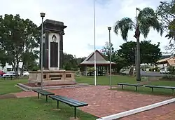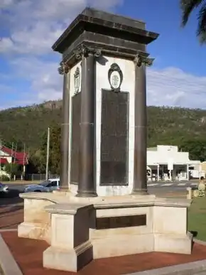 On 30 November 1920, Dr Graham Butler laid the foundation stone of the Esk War Memorial.[17] The finished memorial was unveiled by General Lachlan Chisholm Wilson on 27 August 1921.[18] The memorial records the names of 462 Shire residents who enlisted during the First World War. It also contains bronze honour rolls bearing the names of 83 local men who died during the war. Four commemorative plaques have subsequently been added to the structure. The war memorial stands in Esk Memorial Park, which also contains a memorial to Captain Logan, who was murdered while exploring the Brisbane Valley in 1830.[19][20]