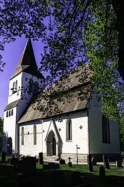 Eskelhem Church was preceded by a wooden church, of which nothing remains. Circa 1200 it was replaced by a stone church. The walls of the nave of the present church are all that remains of this edifice. The church was successively enlarged and rebuilt until it received its present form in the middle of the 14th century. Internally, the church is decorated with different sets of murals, dating from the end of the 13th century and the 15th, the latter by the Master of the Passion of Christ. Among the church furnishings, the baptismal font from the 12th century, probably made by the artist or workshop today referred to as Byzantios, and the triumphal cross, made around 1250 both deserve mention.[1]