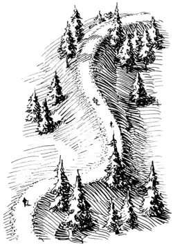 The term esker is derived from the Irish word eiscir (Old Irish: escir), which means "ridge or elevation, especially one separating two plains or depressed surfaces".[4] The Irish word was and is used particularly to describe long sinuous ridges, which are now known to be deposits of fluvio-glacial material. The best-known example of such an eiscir is the Eiscir Riada, which runs nearly the whole width of Ireland from Dublin to Galway, a distance of 200 km (120 mi), and is still closely followed by the main Dublin–Galway road