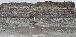 The Eskridge Shale or Eskridge Formation is an Early Permian geologic formation in Kansas. Its outcrop runs north–south through Kansas, extending into Oklahoma and Nebraska.[1] While named a shale, it features extensive, spectacular red and green stacked paleosol mudstones, these mudstones showing prominent vertical tubular carbonate concretions, possibly from roots or vertebrate burrows.[2]