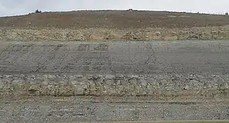 ![]() Fresh excavation of Eskridge Shale (green and red mudstone band and gray marine shale) above the Neva Limestone and below the Cottonwood Limestone, Stag Hill roadcut of K-18 southwest of Manhattan, Kansas, 2013. ![]() | |