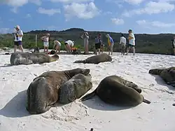 While Española Island is one of the oldest of the Galápagos Islands, this island is dying, slowly becoming a rocky, barren land with little or no vegetation. Its large bays, however, have soft sand and attract Galápagos sea lions. A major draw is the waved albatrosses since, from March to January, almost the entire world population breeds on the island. Another draw is the mating dances of blue-footed boobies. Two spots are especially popular, Gardner Bay (Bahía Gardner) with its beach and Suarez Point (Punta Suárez) because of its varied bird-life. This island has its own species of animals, such as the Hood mockingbird, which has a longer and more curved beak than the one on the central islands; the Española lava lizard; and the marine iguana of the subspecies venustissimus, which has red markings on its back. There are also swallow-tailed gulls, Galapagos hawks, and other birds. The island has been recognized as an Important Bird Area (IBA) by BirdLife International.[4] In January 2020, it was widely reported that a male Galápagos tortoise named Diego fathered and resurrected the island tortoise population, saving the diminishing species from near extinction.[5]