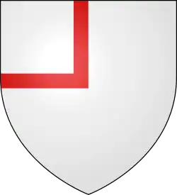 Esquarre (Fr., alternately escarre, esquierre;[1] as Anglo-Norman alternately esquarie, esquire, esquierre, esquerre[2]) is a name for both a heraldic ordinary[3] and a set of related mobile charges.[4] As an ordinary, the Esquarre is defined as a charge that borders a quarter (Fr. franc quartier, or a singular quarter as charge)[5] on its two interior edges abutting the field.[6] The Esquarre isolates the quarter from the rest of the field.[7] De Galway suggested that the Esquarre is employed when both quarter and field are the same tincture.[8] The shape of the ordinary is likened to a carpenter's square, a tool formed of two arms joined perpendicularly.[9] When the two arms are of unequal length, the term potence (Fr.)[10] is also used, a term likening the form of this variant to a joined post and crossbeam, or gallows/scaffold.[11]