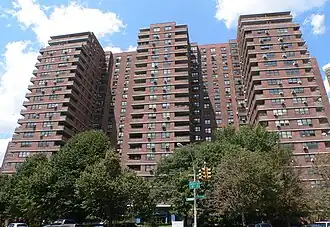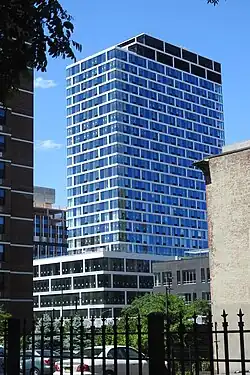 There are both public housing and condominiums in the area. In the SPURA area, public housing is operated by the Seward Park Housing Corporation, part of the Cooperative Village, located in the triangle between Grand Street and East Broadway, and abuts Seward Park. The buildings, designed by Herman Jessor, were finished in 1959.[72] Condominiums include the Blue Tower at 105 Norfolk Street, designed by Bernard Tschumi, opened in 2007 with 32 condominium apartments over 16 stories, a ground floor commercial space occupied by the Thierry Goldberg Gallery, and a roof terrace for residents on the third floor, using a common setup with commercial space at the ground floor with residential space above. The Blue Tower is not LEED certified. The tower had a characteristic slant that sets it apart from other buildings in the vicinity.[73]