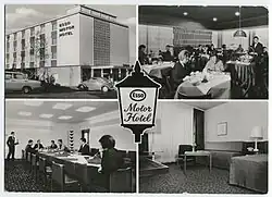 Fourteen hotels were in use in February 1968,[6] six of them in Sweden and an ambitious expansion plan has been launched. The word "Motel" was avoided in order to emphasize the extra features the "Motor Hotel" provides compared to a normal motel. In Sweden the number of hotels should raise to 19 by half 1968, 27 by 1969 and 35 by 1970.[7] In 1968 the British holidaymakers were connected with the Esso route from the hotel in South Mimms via the carferries to Belgium and the new hotel in Born in the Netherlands. In Denmark the hotel in Billund was opened together with Legoland. In Casteau (Belgium) a hotel was opened next to SHAPE situated in Casteau since 1 April 1967 and in Maidenhead a new hotel was combined with the Esso trainingcentre.[8] The number of hotels had been more than doubled by the end of 1968, although the expansion in Sweden was behind schedule. After 1968 the growth slowed down and the next doubling wasn't reached until the end of 1972. Further expansion followed mainly in Scandinavia and with more business related hotels in Germany, Belgium and the Netherlands (Antwerp and Amsterdam in 1969 and Velp in 1970). Edinburgh still expected tourists as customers[9] but business travellers got a bigger share in Britain as well. From 1970 on new hotels were built with at least 100 rooms and smaller hotels were enlarged. At the beginning of 1972 many, also American, competitors from Esso Motor Hotel were building or completing several hotels in the European cities and Esso had several hotels nearing completion in Norway, Britain[10] and Germany.[11] These new beds were added to the hotel capacity already created since the mid sixties resulting in a surplus of rooms.