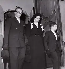 The wedding took place on December 1, 1928, in the rather small St. John's Episcopal Church in Pleasantville, New York.[8][9] At the wedding the bride wore a Swedish bridal crown in platinum and rock crystal and Queen Sophia's bridal veil in openwork lace. The veil was held by a coronet in silver and crystals, which was specially made by the Swedish court jeweler.[10] Prince Gustaf Adolf was the Best man and Prince Sigvard the Marshal. More than 1500 guests were invited to the festivities on the Manville estates, Hi-Esmaro. Wedding expenses totaled $1.5 million.[11]