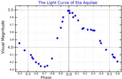 η Aquilae A is a Cepheid variable star, discovered by Edward Pigott in 1784.[15][3] It has an apparent magnitude that ranges from 3.49 to 4.3 over a period of 7.177 days.[3] Along with Delta Cephei, Zeta Geminorum and Beta Doradus, it is one of the most prominent naked eye Cepheids;[16] that is, both the star itself and the variation in its brightness can be distinguished with the naked eye. Some other Cepheids such as Polaris are bright but have only a very small variation in brightness.
