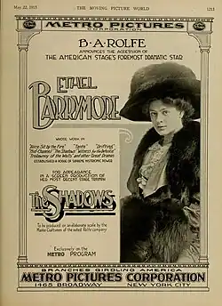 Barrymore appeared in her first feature motion picture, The Nightingale, in 1914. Members of her family were already in pictures; uncle Sidney Drew, his wife Gladys Rankin, and Lionel had entered films in 1911 and John made his first feature in 1913 after having debuted in Lubin short films in 1912. She made 15 silent pictures between 1914 and 1919, most of them for the Metro Pictures studio. Most of these pictures were made on the East Coast, as her Broadway career and children came first. A few of her silent films have survived: for example, one reel from The Awakening of Helena Richie (1916) which survives at the Library of Congress, and The Call of Her People (1917) held at the George Eastman House.[15][16]
