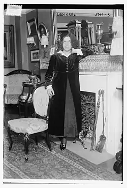 From her official American debut in New York's Aeolian Hall on 20 January 1913,[6] Leginska's popularity in the U.S. was growing, aided by both the careful staging of her performances, with well-thought-out lighting and decor to focus on the performer, and her distinctive style of dressing (favoring menswear) eagerly copied by her young fans, as well as her diminutive size and her youthful appearance that not only made the musical youth more likely to relate to her, but often misled not only her audiences but even the reviewers who would express their astonishment that a person so "young" displayed such skill as hers (this going on all the way into Leginska's late thirties, as made evident in the Detroit News critic Robert Kelly's description of her perform at 37).[12]