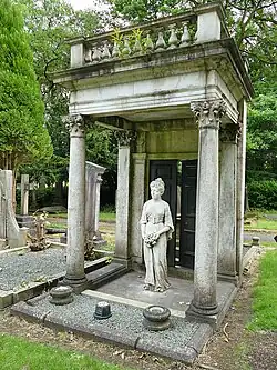 Ethel died at her home in 1911; within a year Walter had married his 22-year-old housekeeper Emily Florence Richardson.[3][5] Walter, an industrial chemist, had the memorial erected in 1913 and said he had been inspired by similar graves he had seen in Italy.[1][3] There are two suggestions as to the inspiration for the monument. The first is that it symbolises the love between the couple and depicts Ethel in the entrance to her house waiting for her husband to return home.[1] The open door indicates that she waits to be reunited with her husband in death.[5] The other is that it is a mark of regret by Walter for his womanising and that this is reflected in the sad expression on the face of the statue.[1] The sculptor of the piece is not known.[6]