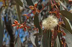 Eucalyptus dwyeri, commonly known as Dwyer's red gum or Dwyer's mallee gum,[2] is a species of small tree, sometimes a mallee that is endemic to eastern Australia. It has smooth, white or cream-coloured bark, lance-shaped to curved adult leaves, flower buds in groups of seven and conical, bell-shaped or hemispherical fruit.