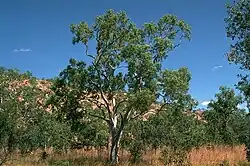 Kimberley white gum is found along swampy river flats in forest and woodland throughout the western Kimberley region where it grows in sandy alluvium.[3][4]