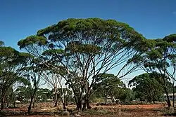 This eucalypt is found on plains and low rises and around clay flats and salt lakes and swamps in the Mid West, Wheatbelt and Goldfields-Esperance region of Western Australia where it grows in gravelly sandy-clay-loam soils.[4] It has a scattered distribution from Coorow in the north west to Ravensthorpe in the south extending to Coolgardie in the east.[3]