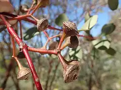 Eucalyptus websteriana is a mallee that typically grows to a height of 4–5 m (13–16 ft) with a spreading habit, and forms a lignotuber. It has reddish brown minnirichi bark on the trunk and branches. The adult leaves have a distinctive heart shape and the tree has a compact crown, providing lightly dappled shade that benefits plants in the undergrowth. The leaves are the same shade of greyish green on both sides, 18–45 mm (0.71–1.77 in) long and 9–30 mm (0.35–1.18 in) wide, tapering to a petiole 5–17 mm (0.20–0.67 in) long. The flower buds are arranged in leaf axils in groups of seven on an unbranched peduncle 9–12 mm (0.35–0.47 in) long, the individual buds on pedicels 3–7 mm (0.12–0.28 in) long. Mature buds are spherical, 5–10 mm (0.20–0.39 in) long and 5–8 mm (0.20–0.31 in) wide with a rounded operculum that has a small point on the top. Flowering occurs from July to November and the flowers are pale cream-coloured to yellow. The fruit is a woody hemispherical, sometimes conical, capsule 3–6 mm (0.12–0.24 in) long and 7–12 mm (0.28–0.47 in) wide with the valves protruding prominently.[3][4][5]