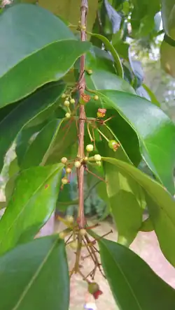 The adult tree is 3–6 m (9.8–19.7 ft) tall,[3] with rounded or conical canopy up to 2 m (6.6 ft) wide. New leaves are rusty-brown, turning yellow and then deep dark green. The reddish-brown bark peels off naturally showing a smooth reddish trunk. Leaves are simple, in opposite pairs, with smooth leathery texture, smooth edges, and the apex curved downwards.