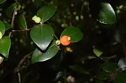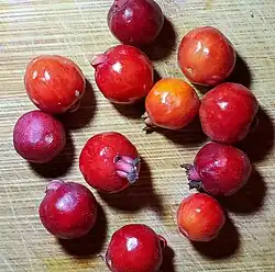 Fruits are round, about 6 to 8 mm diameter, orange initially and ripening to bright red.[10][11][12] Fruits are edible and sweet tasting.[8]