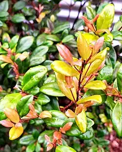 Leaf petioles are only 3 mm or less. Leaves are somewhat coriaceous and dark green but younger leaves are membranous and reddish or pale green. The underside is punctate with small scattered glands. Leaves are nearly symmetrical, elliptic or ovate-elliptic, 3.5 to 5.5 cm long. The base forms an acute angle, and the apex is obtuse. Leaf margins are slightly recurved. Leaves have about 6 slender and obscure lateral nerves per side, which form subtle loose anastomoses.