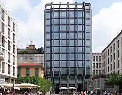 An exuberant and strong-willed personality, towards the end of the war, Soncini began to find the partnership with Ponti restrictive. So, when in 1947 his brother Ermenegildo graduated in architecture, he took the opportunity to leave Ponti and open an independent studio, the Studio Eugenio and Ermenegildo Soncini in the Palazzina Sessa in via Ariosto 1 in Milano. After World War II, he followed his own interests, concentrating on the office and hospital building sectors. His architectural production mainly concerned the Milanese area, with a significant amount of office buildings, clinics and educational institutions. Among the most significant ones were the Torre Breda[4] (originally known as Grattacielo di Milano), the La Madonnina[5] and Capitanio Clinics, the office buildings of Michelin, Galbani[6] and Milano Assicurazioni, the Torre Tirrena and the Palazzo La Serenissima/Campari. Besides working with his brother Ermenegildo, he collaborated with Luigi Mattioni, Pier Luigi Nervi and Giuseppe Pestalozza.