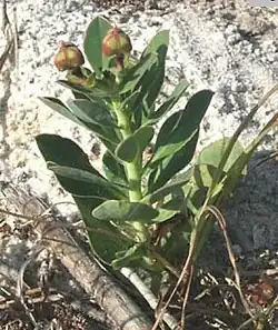 This is a perennial herb growing up to 30 or 40 centimeters in maximum height. The leaves are lance-shaped to oval and green to red in color, measuring up to 6 centimeters long. They are fleshy and succulent, and the roots are tuberous, helping the plant survive in dry seasons and in sandy soils that retain little water. The species is dioecious, with female plants bearing wider leaves and few flowers and male plants having narrower leaves and many clusters of flowers. The flower is a maroon or red and green cyathium. The fruit is explosively dehiscent, releasing silver, gray, or brown seeds.[2][1]