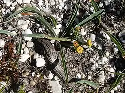 Its habitat is usually rocky or sandy soils in exposed areas of renosterveld, fynbos or succulent karoo vegetation.[8]