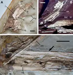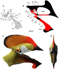 Due to the crushing of the skull, its fragments, mainly representing elements from the area around the right eye socket, show little detail. The lower jaws have a preserved length of 2 centimeters (0.79 in) and an estimated original length of 255 millimeters (10.0 in). In their front parts the lower jaws are fused by a symphysis into a mandibula. The symphysis has a concave upper profile and features a large crest on the underside, pointing downwards for at least 9 centimeters (3.5 in). The back edge of the crest is recurved; the curvature of the front edge cannot be exactly established because of damage. The crest is the longest relative to lower jaw length of any known pterosaur. The internal bone structure of the crest is spongy. The rod-like first ceratobranchialia pair of the hyoid have a length of 135 millimeters (5.3 in) and a cross-section of 2 millimeters (0.079 in).[1]