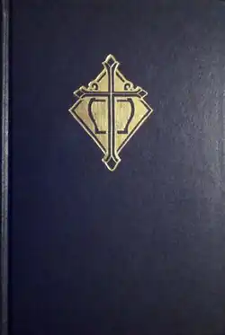 The cover of this hymnary is black with a gold imprinted logo on the front cover. The logo used is a Latin cross with budded arms superimposed over a lyre, on a diamond-shaped background. Inside these covers one finds more than hymn texts: The Church Year is summarized, followed by the full texts of the Augsburg Confession; the texts of the Apostles' Creed, the Nicene Creed, and the Athanasian Creed; and Martin Luther's Small Catechism . Prayers are included as well as four different rites of the Divine Service. The Divine Service: Rite One is based on the Danish Ritual of 1685; The Divine Service Rite Two is from the Common Service from 1888; The Divine Service: Rite Three is a new setting by Dr. Alfred Fremder; and The Divine Service: Rite Four is the Lutheran "Chorale Mass".[1] Other services included here are The Office of the Prime, Matins, Vespers, Compline, and others. A Service of Private Confession and Absolution is also included. Psalms, canticles, and other resources are also found here.