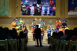For evangelicals, there are three interrelated meanings to the term worship. It can refer to living a "God-pleasing and God-focused way of life," specific actions of praise to God, and a public worship service.[53] Diversity characterizes evangelical worship practices. Liturgical, contemporary, charismatic and seeker-sensitive worship styles can all be found among evangelical churches. Overall, evangelicals tend to be more flexible and experimental with worship practices than mainline Protestant churches.[54] It is usually run by a Christian pastor. A service is often divided into several parts, including congregational singing, a sermon, intercessory prayer, and other ministry.[55][56][57][58] During worship there is usually a nursery for babies.[59] Children and young people receive an adapted education, Sunday school, in a separate room.[60]
