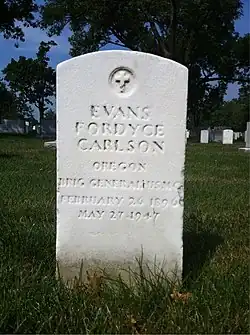 Evans Fordyce Carlson (February 26, 1896 – May 27, 1947) was a decorated and retired United States Marine Corps general officer who was the leader of "Carlson's Raiders" during World War II. Many credit Carlson with developing the tactics and attitude that would later come to define America's special operations forces. He is renowned for the "Makin Island raid" in 1942, and his raiders' "Long Patrol" (aka Carlson's patrol) behind Japanese lines on Guadalcanal, in which 488 Japanese were killed. Carlson popularized the phrase "gung-ho".[1]