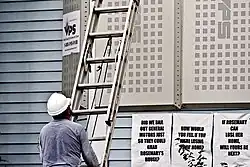 Steel screen installed over windows as an evicted tenant's property is removed. Minneapolis, Minnesota.